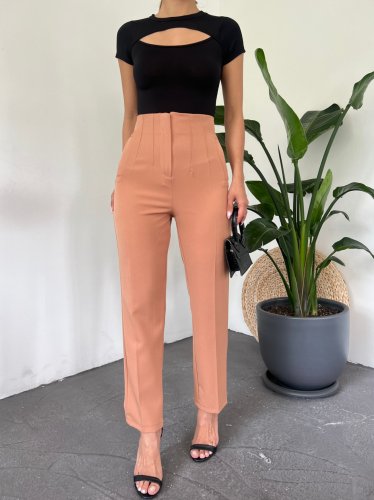 Yüksek Bel Cep Detaylı Fermuarlı Pantolon -Tarçın