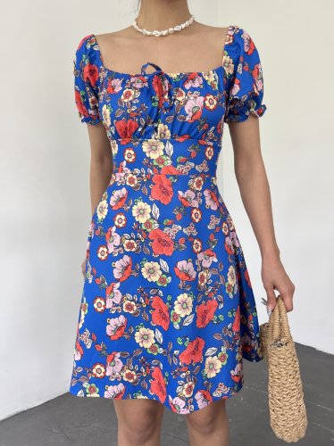 Yakası Lastikli Bağcık Detaylı Mini Elbise -Saks
