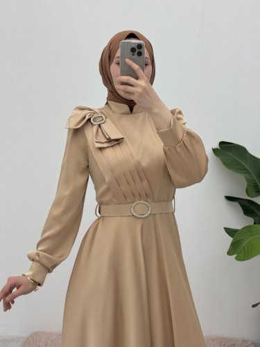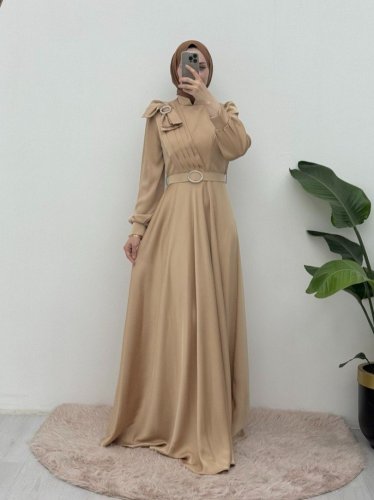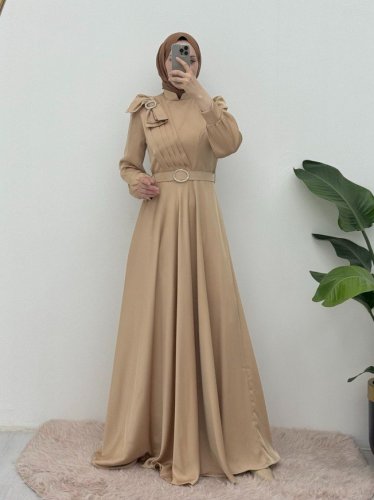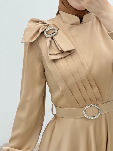 Broşlu Fiyonklu Taşlı Kemerli Saten Abiye -Bej