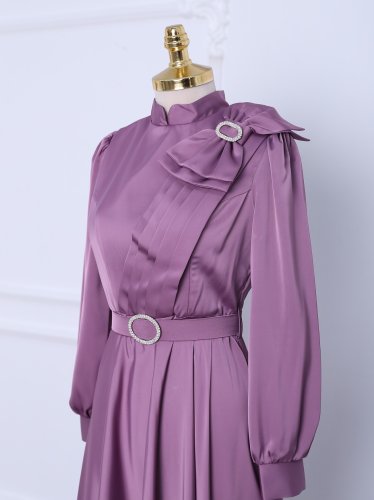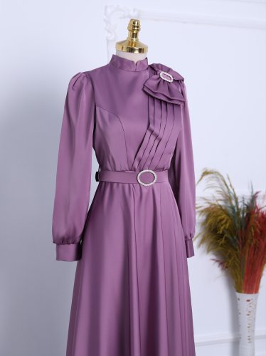 Broşlu Fiyonklu Taşlı Kemerli Saten Abiye -Lila