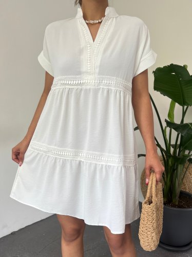 V Yaka Fistolu Ayrobin Elbise -Beyaz