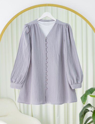 Top Düğmeli V Yaka Krinkıl Gömlek -Gri