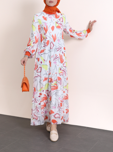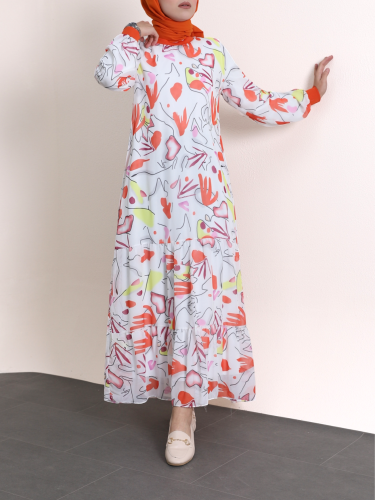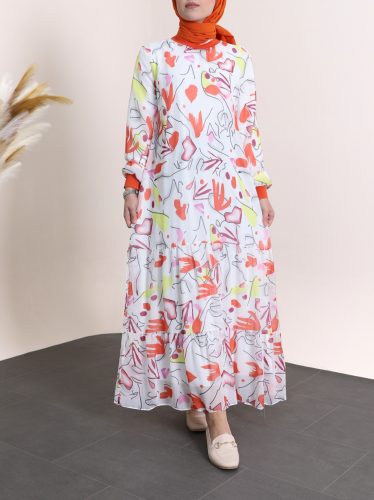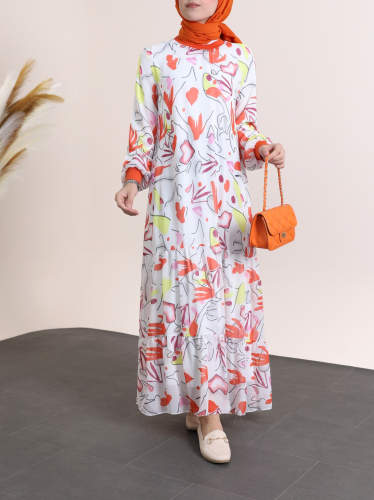 Yakası Ribanalı Eteği Katlı Desenli Şifon Elbise -Turuncu