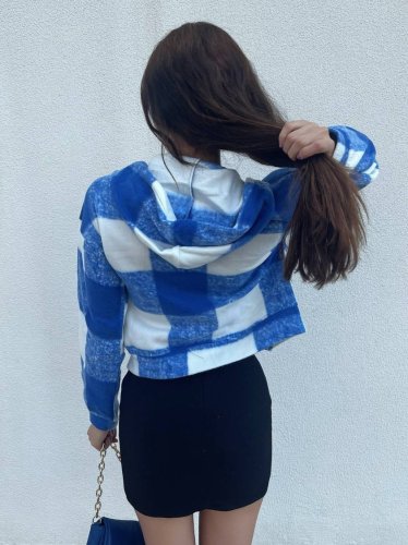 Kapşonlu Ekose Polar Crop Ceket -Mavi