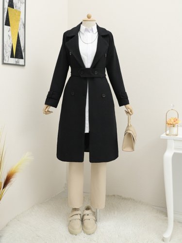Kemerli Astarlı Bolero Detaylı Kaban -Siyah