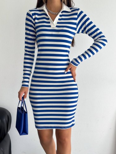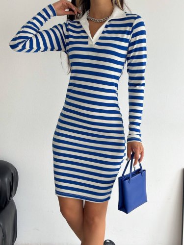 Yakalı Çizgili Uzun Kol Elbise -Mavi