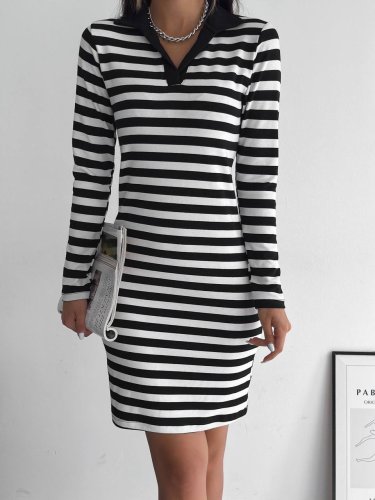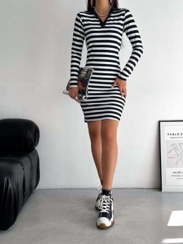Yakalı Çizgili Uzun Kol Elbise -Siyah
