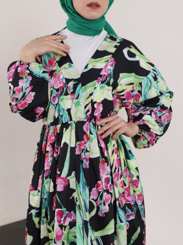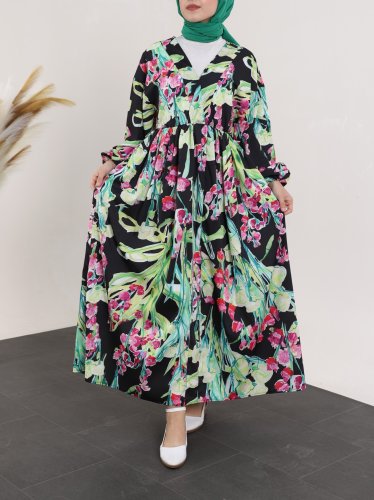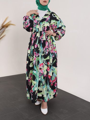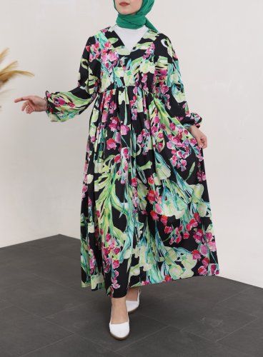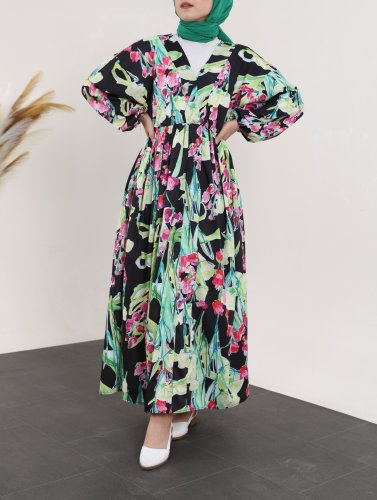 Beli Lastikli Yakası Açık Uzun Elbise -Yeşil