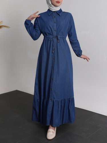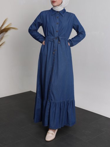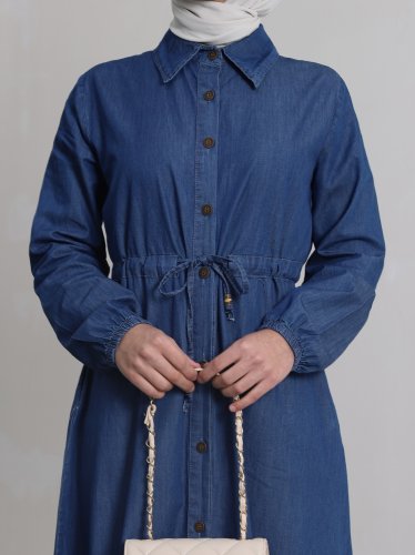 Tünel Bağcıklı Boydan Düğmeli Kot Elbise -İndigo