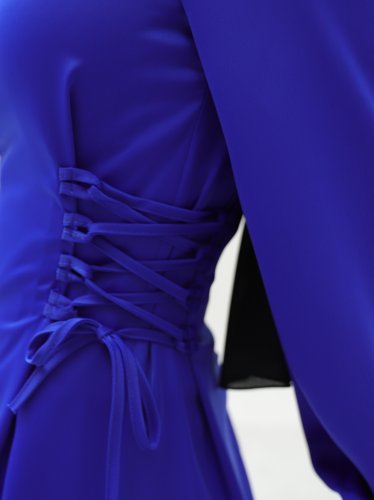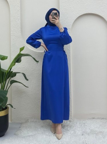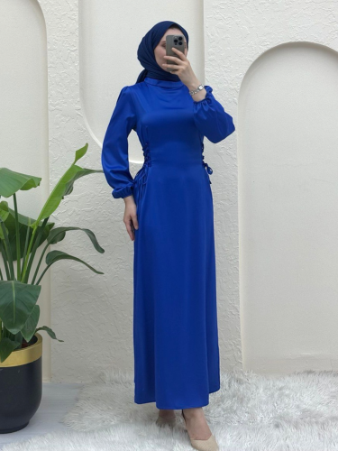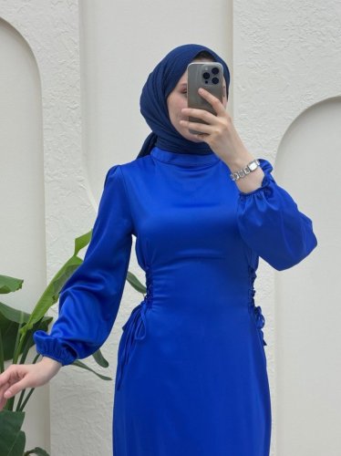 Yanları Bağlamalı Kolu Lastikli Saten Elbise -Saks