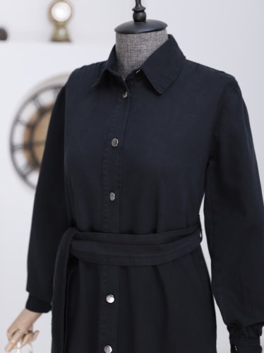 Boydan Düğmeli Eteği Fırfırlı Kot Elbise -Siyah