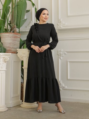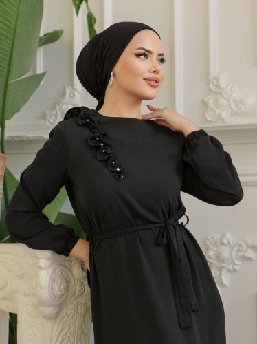 Fırfır Taş Detaylı Parça Eteklii Kemerli Ayrobin Elbise -Siyah