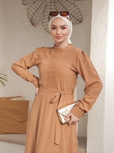 Çıma Detaylı Kemerli Ayrobin Elbise -Tarçın