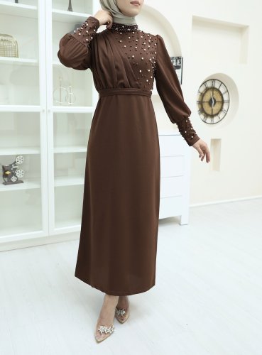 Kruvaze Yaka İnci Detaylı Krep Elbise -Kahve