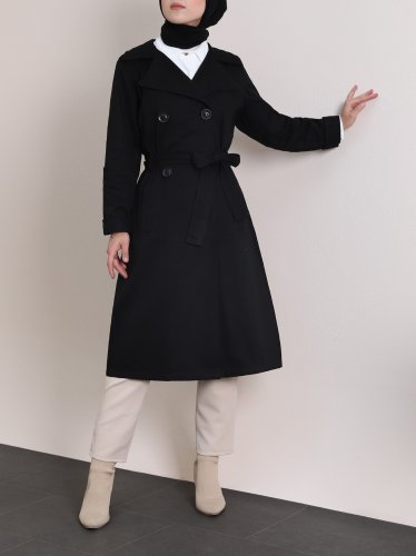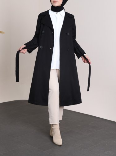 Kolu Katlamalı Düğmeli Kemerli Trençkot -Siyah
