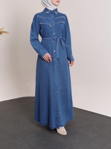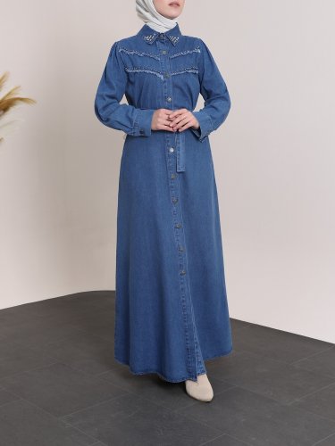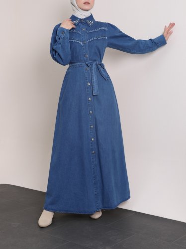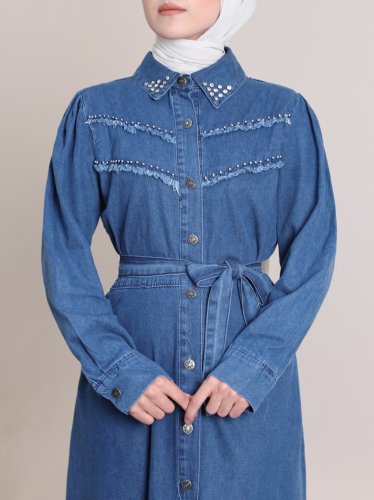 Yakası Ve Göğsü Taşlı Eskitme Kot Elbise -Koyu Mavi