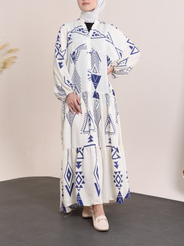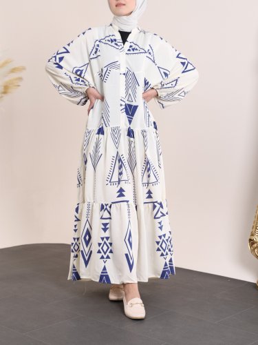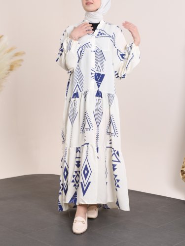 Yarım Düğmeli Kolu Lastikli Desenli Elbise -Ekru