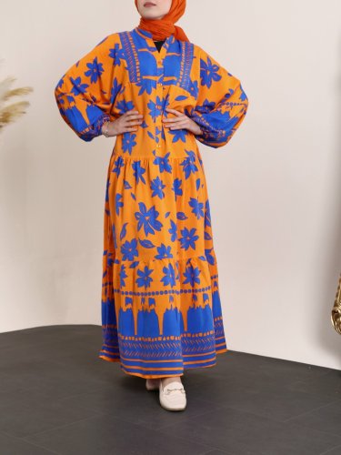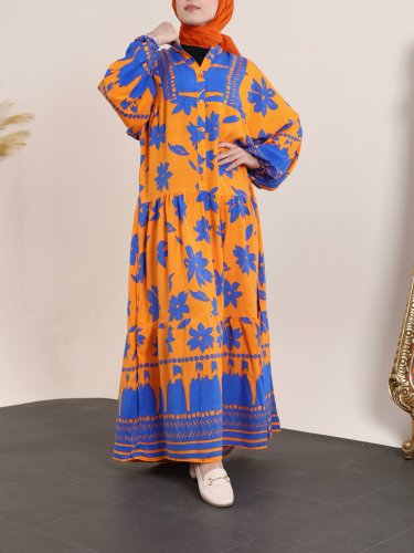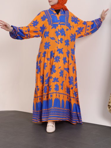 Yarım Düğmeli Kolu Lastikli Desenli Elbise -Turuncu