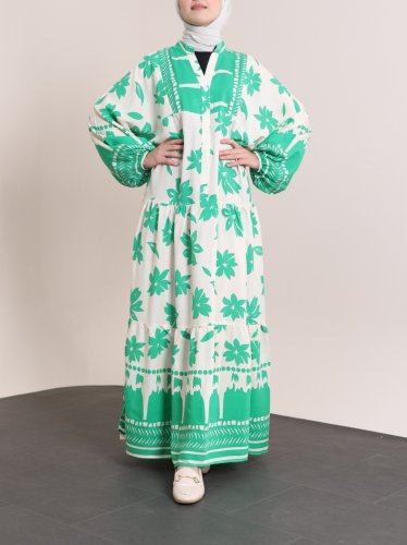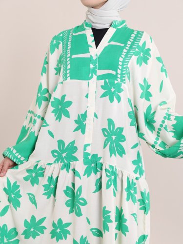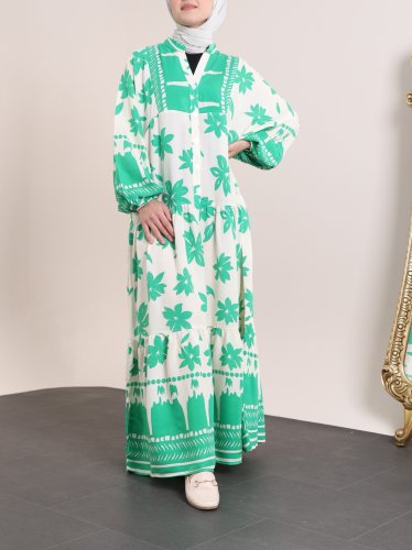 Yarım Düğmeli Kolu Lastikli Desenli Elbise -Yeşil