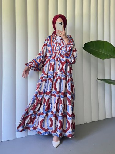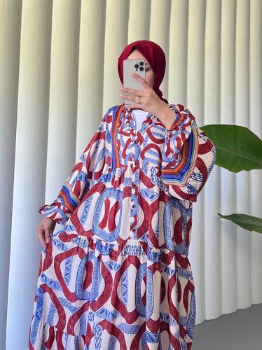 Kolu Lastikli Dik Yaka Yarım Düğmeli Viskon Elbise -Bordo