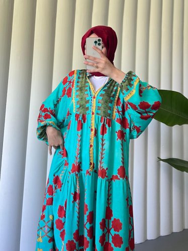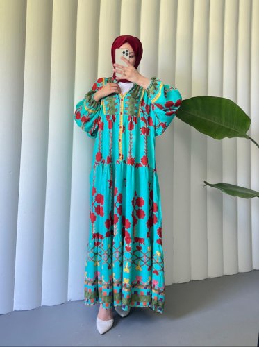 Kolu Lastikli Dik Yaka Yarım Düğmeli Viskon Elbise -Turkuaz