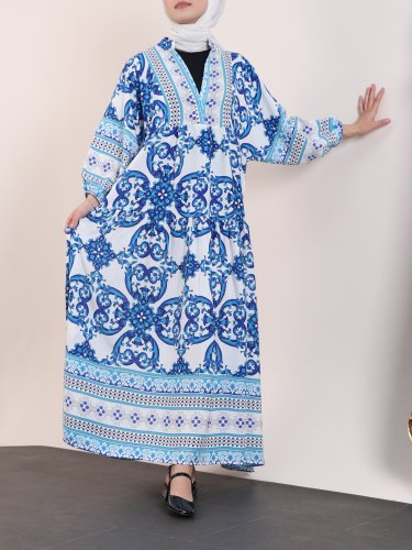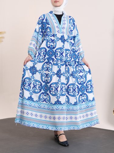 V Yaka Yarasa Kol Parçalı Viskon Elbise -Koyu Mavi