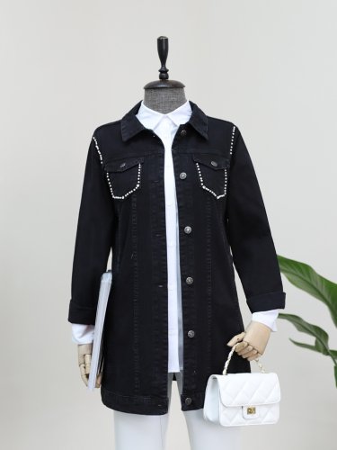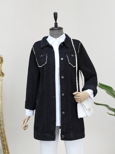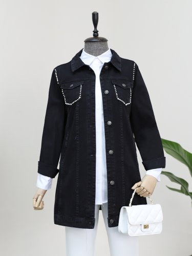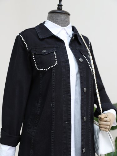 Cebi ve Omuzları İncili Random yıkama Kot ceket -Siyah