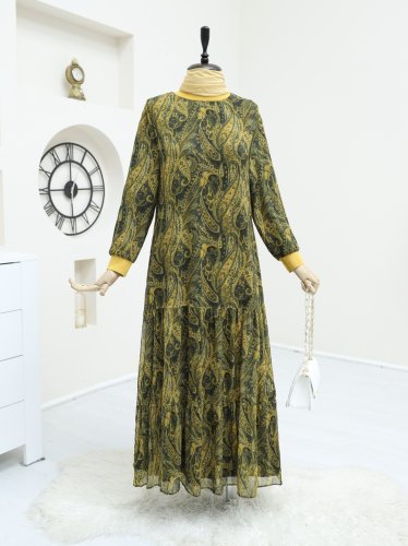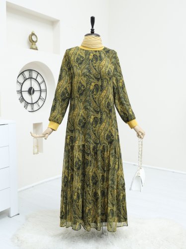 Etnik Desen Eteği Parçalı Astarlı Şifon Elbise -Yağ Yeşili
