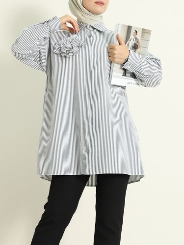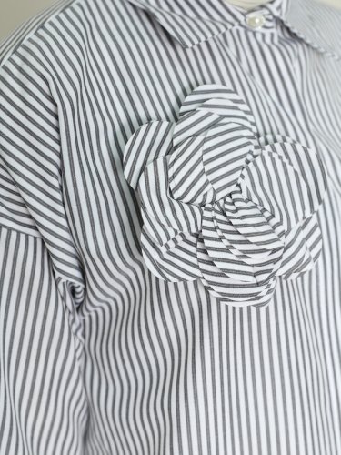 İnci Düğmeli Çizgili Broşlu gömlek -Siyah