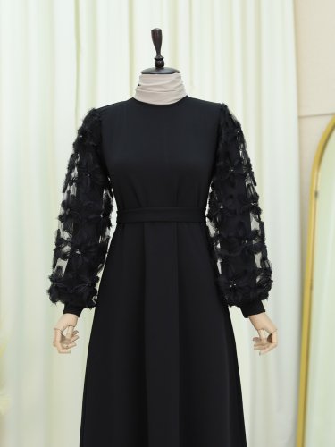 Kabartma Çiçekli Tül Kollu Kemerli Elbise -Siyah
