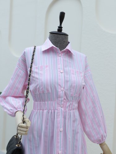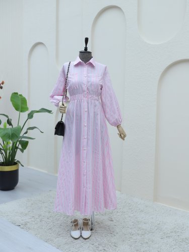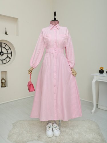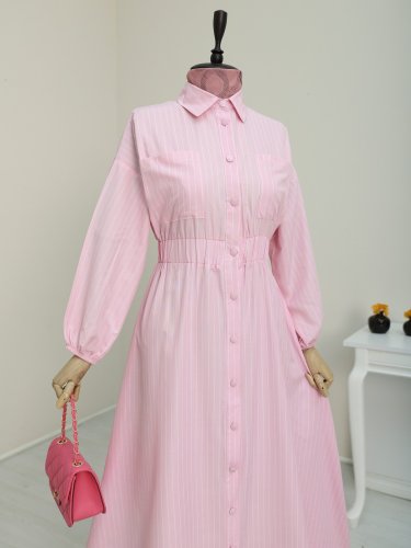 Önden Düğmeli Beli Lastikli Çizgili Elbise -Pembe