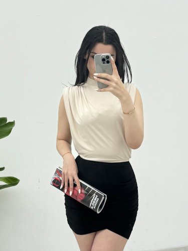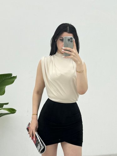 Sıfır Kol Vatkalı Sandy Bluz -Bej