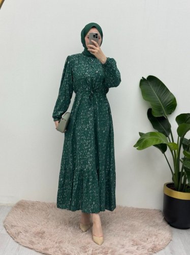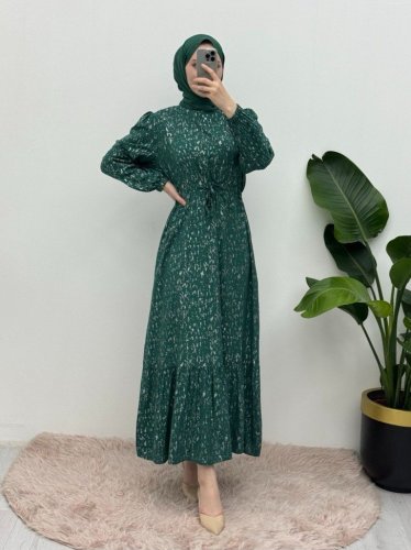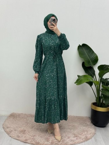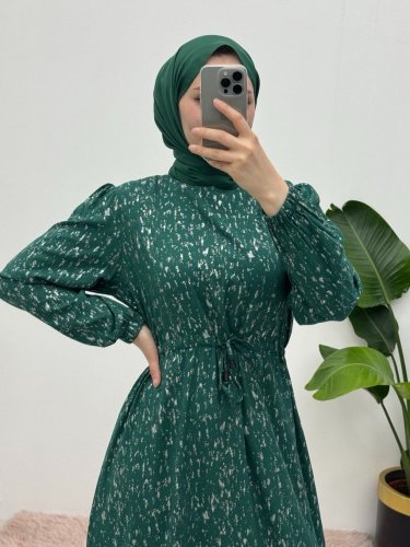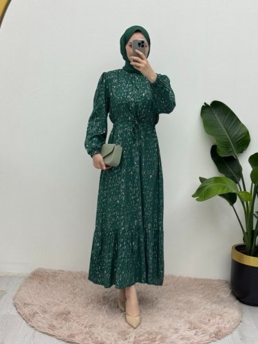 Kırçıllı Belden Büzgülü Elbise -Orman Yş