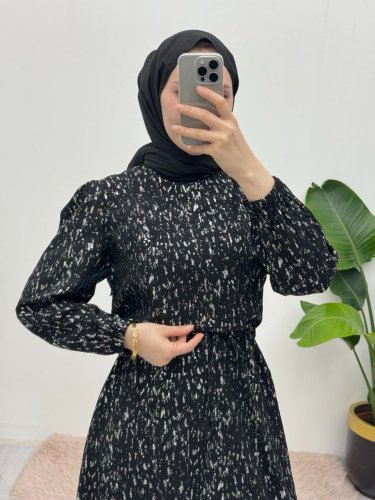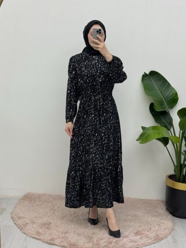 Kırçıllı Belden Büzgülü Elbise -Siyah