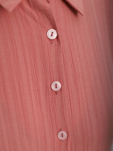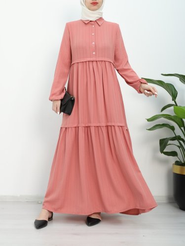 Parçalı Yarım Düğmeli Kolu Lastikli Elbise -Yavruağzı