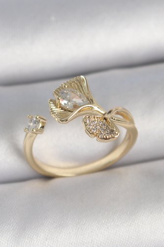 Pirinç Gold Renk Zirkon Taşlı Deniz Kabuğu Model Ayarlanabilir Kadın Yüzük