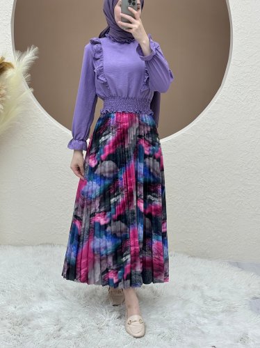 Dijital Baskılı Pliseli Etek -Pembe