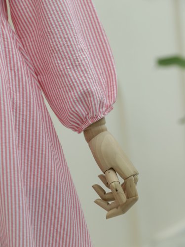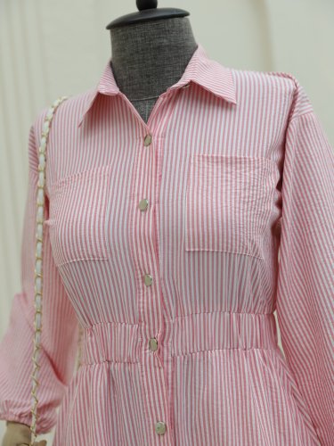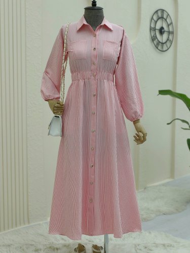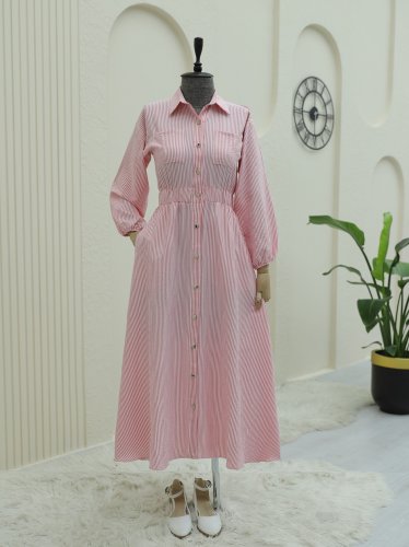 Beli Lastikli Boydan Düğmeli Çizgili Elbise -Pudra