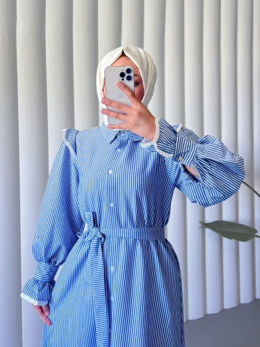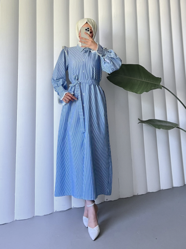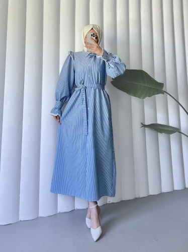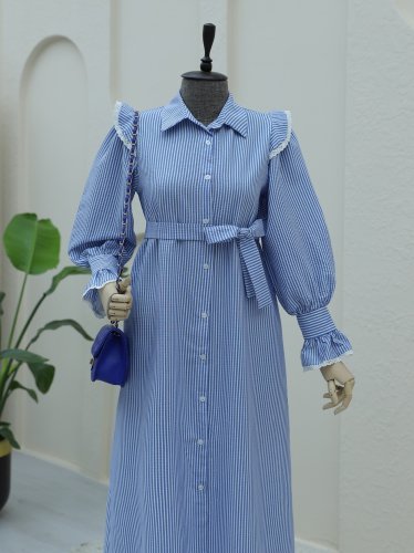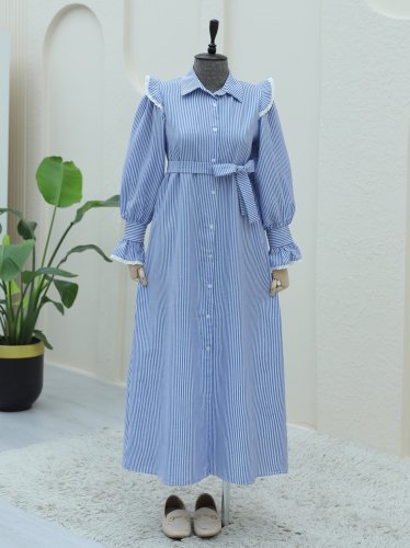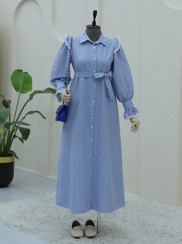 Önü Düğmeli Dantel Detaylı Kemerli Elbise -İndigo