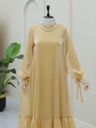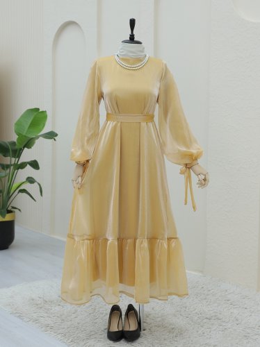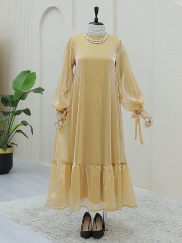 Kolu Bağcıklı Eteği Parçalı Janjan Elbise -Somon