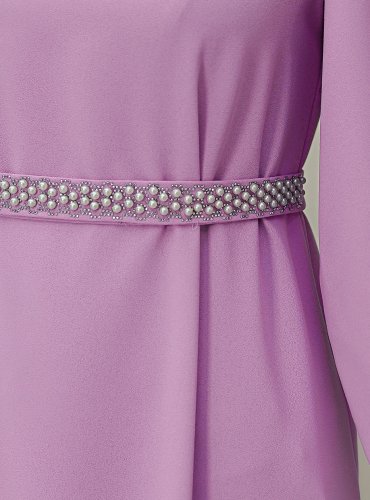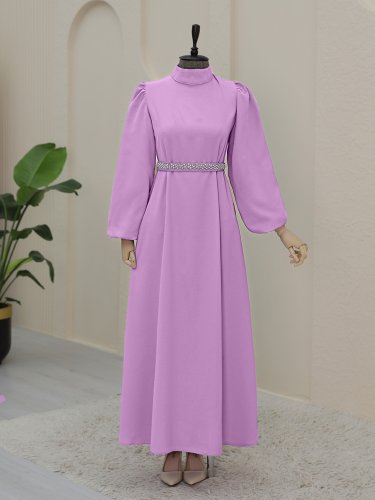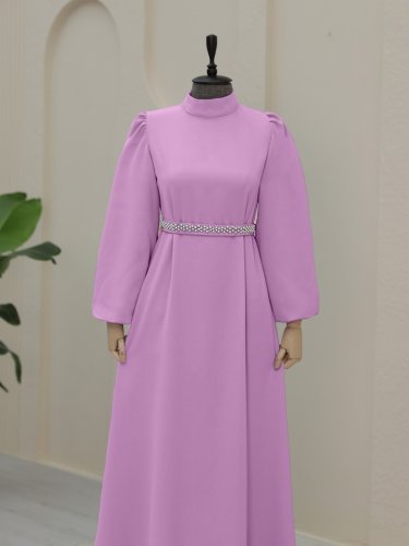 Hakim Yaka Balon Kol Kemerli Elbise -Pembe
