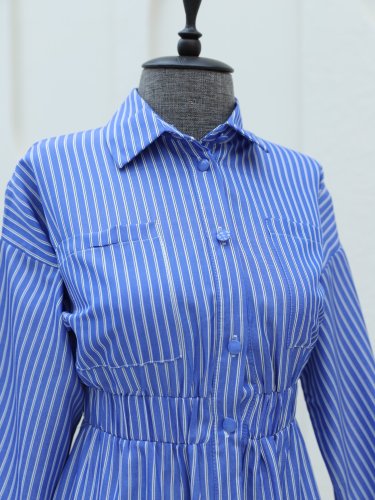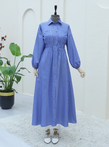 Önden Düğmeli Beli Lastikli Çizgili Elbise -Koyu Mavi