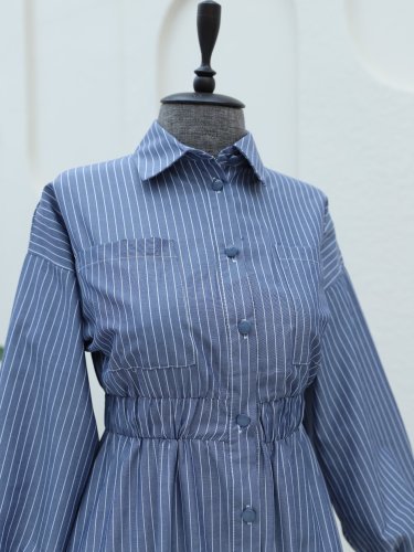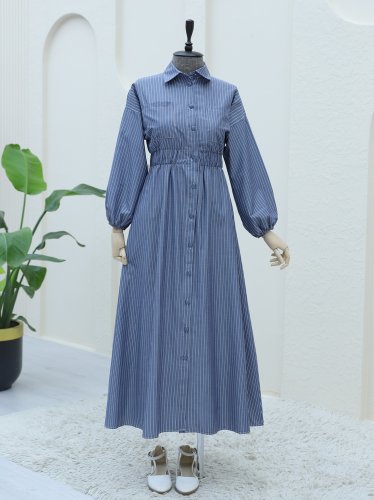 Önden Düğmeli Beli Lastikli Çizgili Elbise -Laci
