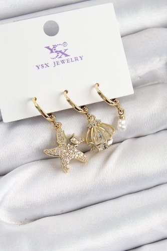 Pirinç Zİrkon Taşlı Deniz Yıldızı Ve İstiridye Model Gold Renk 3lü Kadın Küpe