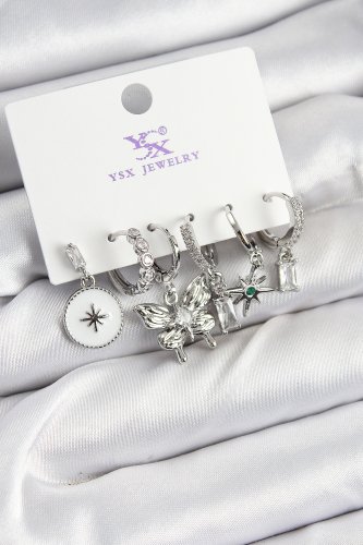 Pirinç Zİrkon Taşlı Kelebek ve Yıldız Model Gümüş Renk 3lü Çift Kadın Küpe