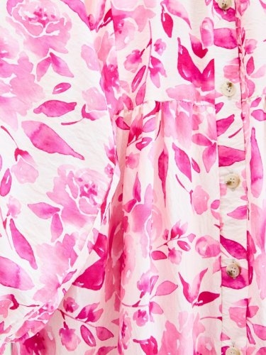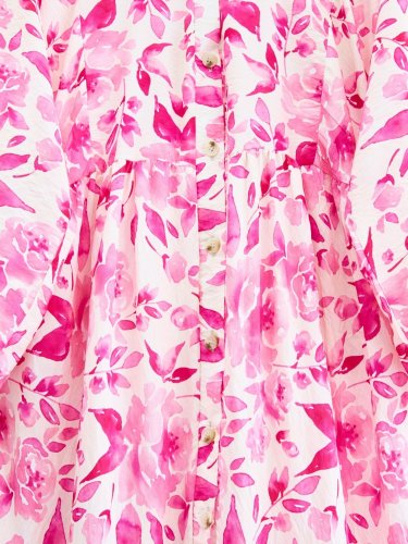 Küçük Yaprak Desen Yarım Düğmeli Kolu Lastikli Elbise -Fuşya