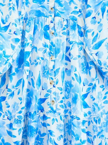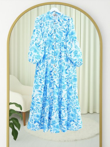 Küçük Yaprak Desen Yarım Düğmeli Kolu Lastikli Elbise -Mavi