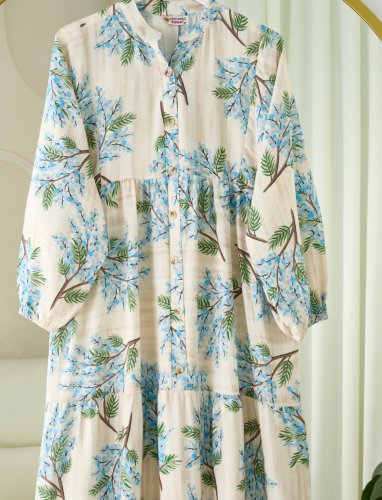 Kolu Lastikli Yarım Düğmeli Desenli Modal Elbise -Mavi