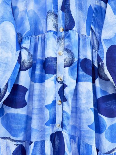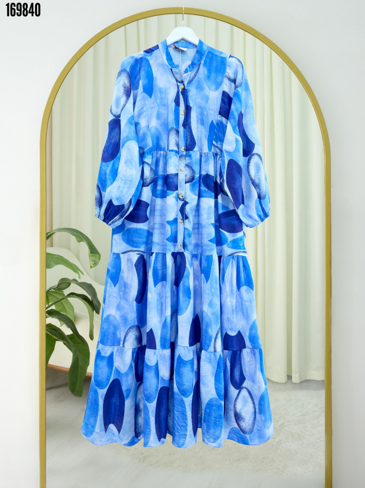 Daire Desen Yarım Düğmeli Kolu Lastikli Elbise -Koyu Mavi
