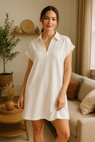 Gömlek Yaka Cepli Süprem Penye Elbise -Beyaz